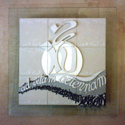 j’ai donc ajouté un dixième carreau en verre pour présenter l’ensemble sur un fond transparent et dépoli une partie pour intégrer SA signature avec le tétragramme !