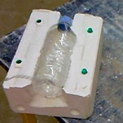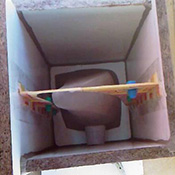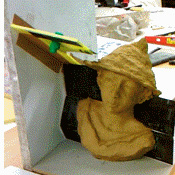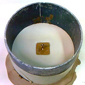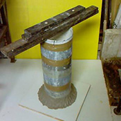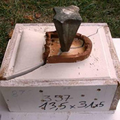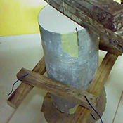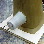 Gobelet plein de terre en guise de piston (avant découpe), + piston d’évasement en terre (± 45°) pour renforcer une zone du moule. Photo 2 : Piston cloué suspendu sur le modèle (prêt à mouler). |
