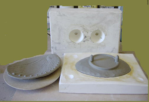 Moule « entre 2 plâtres »Porte-savon, 2 coulées de plâtre. Travail réalisé par Myriam VOGEL (formation Maison de la Terre 2004-2005). |